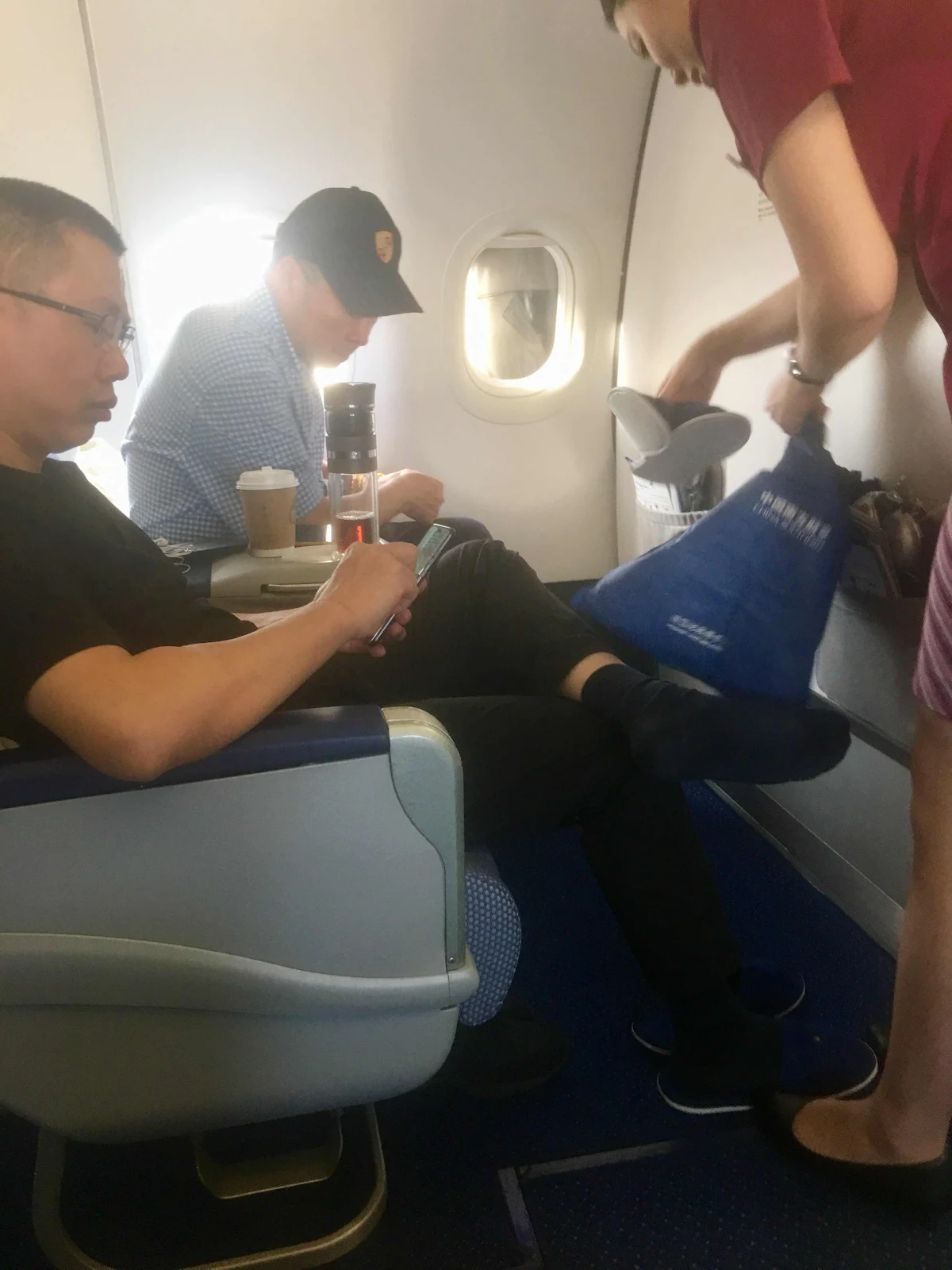 The young flight attendant is most attentive and even offers to put our slippers on us, as she does for the other two business class passengers.