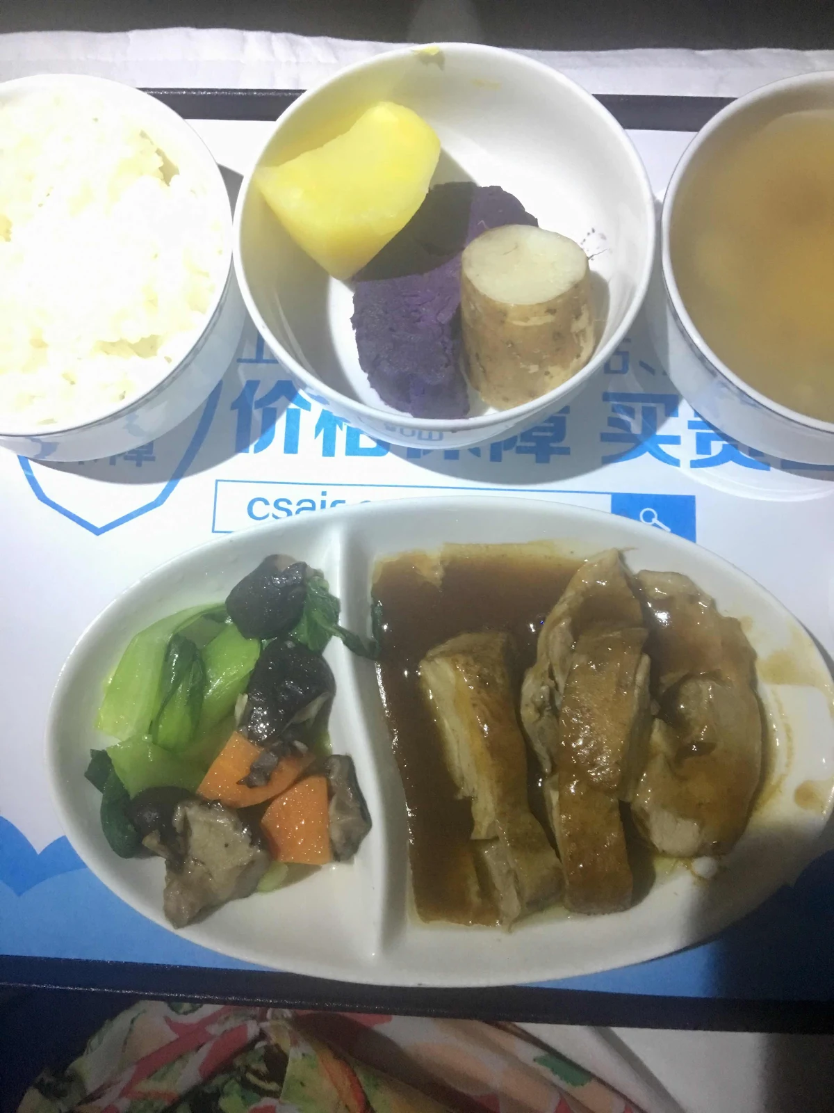 Our flight is surprisingly good, and includes an excellent meal with a choice of entrees, duck for Kathy and spicy beef for Brian.