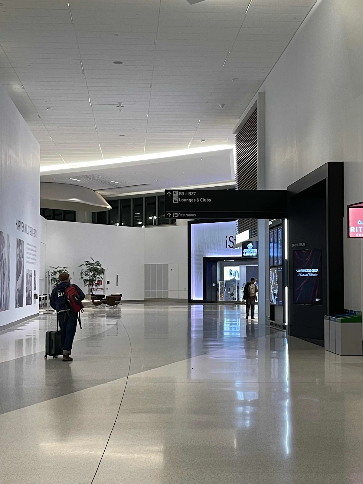 We can’t help but be impressed by the new (2021) and visually stunning Harvey Milk Terminal 1. The TSA PreCheck line was short and features the same kind of convenient pull-out tray arrangement as we’ve seen at LHR and other international airports.