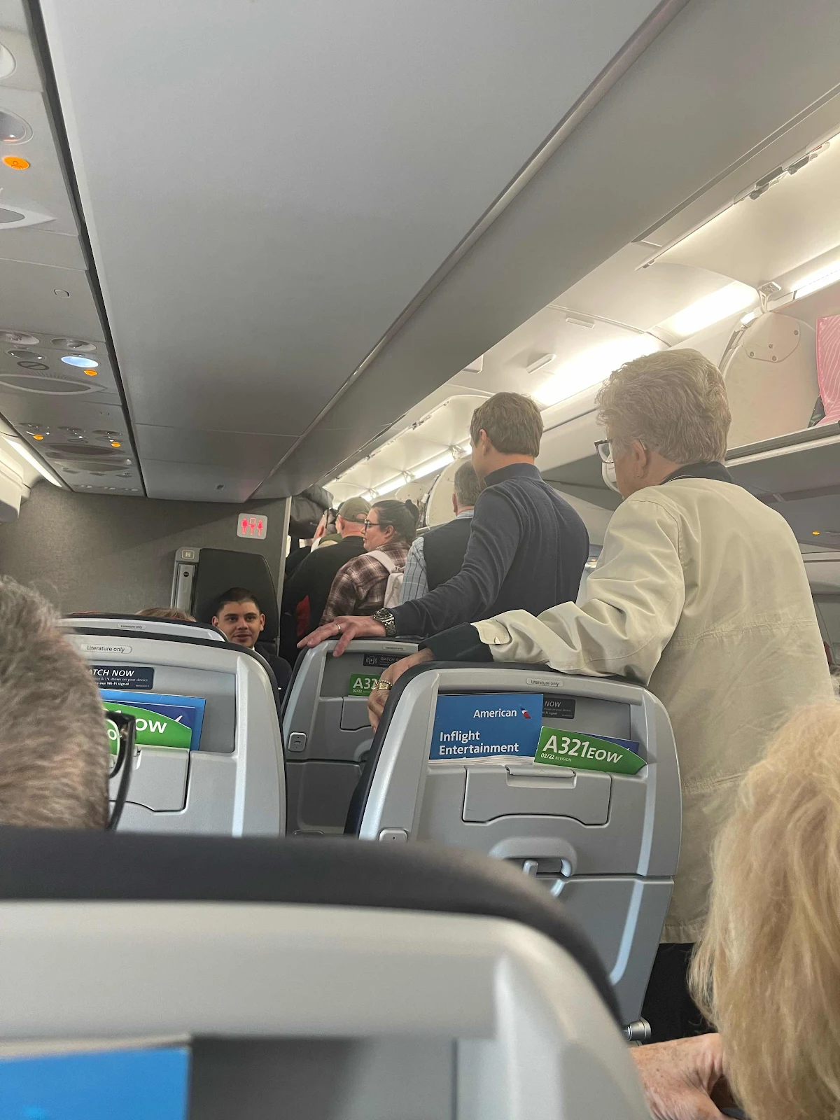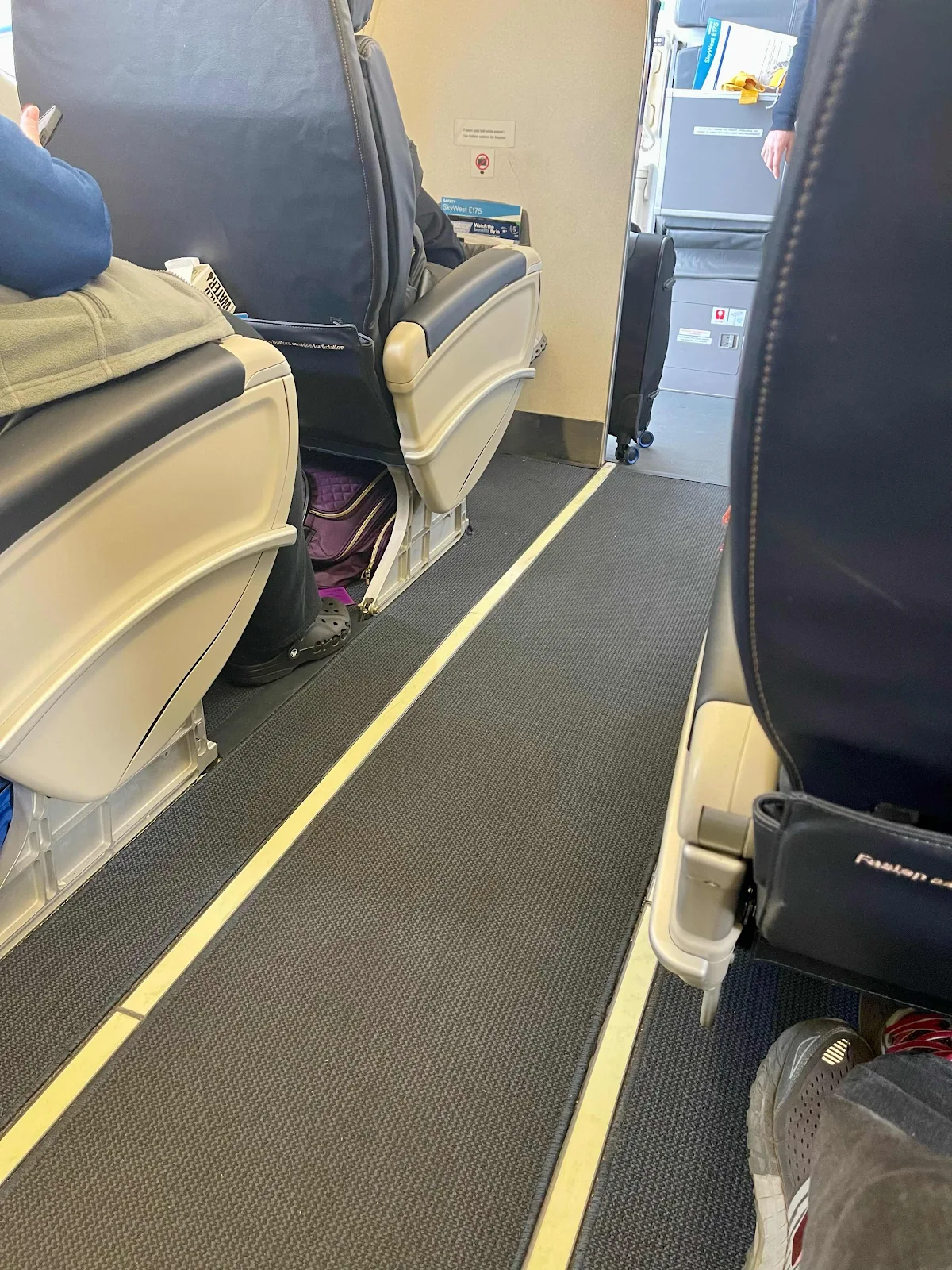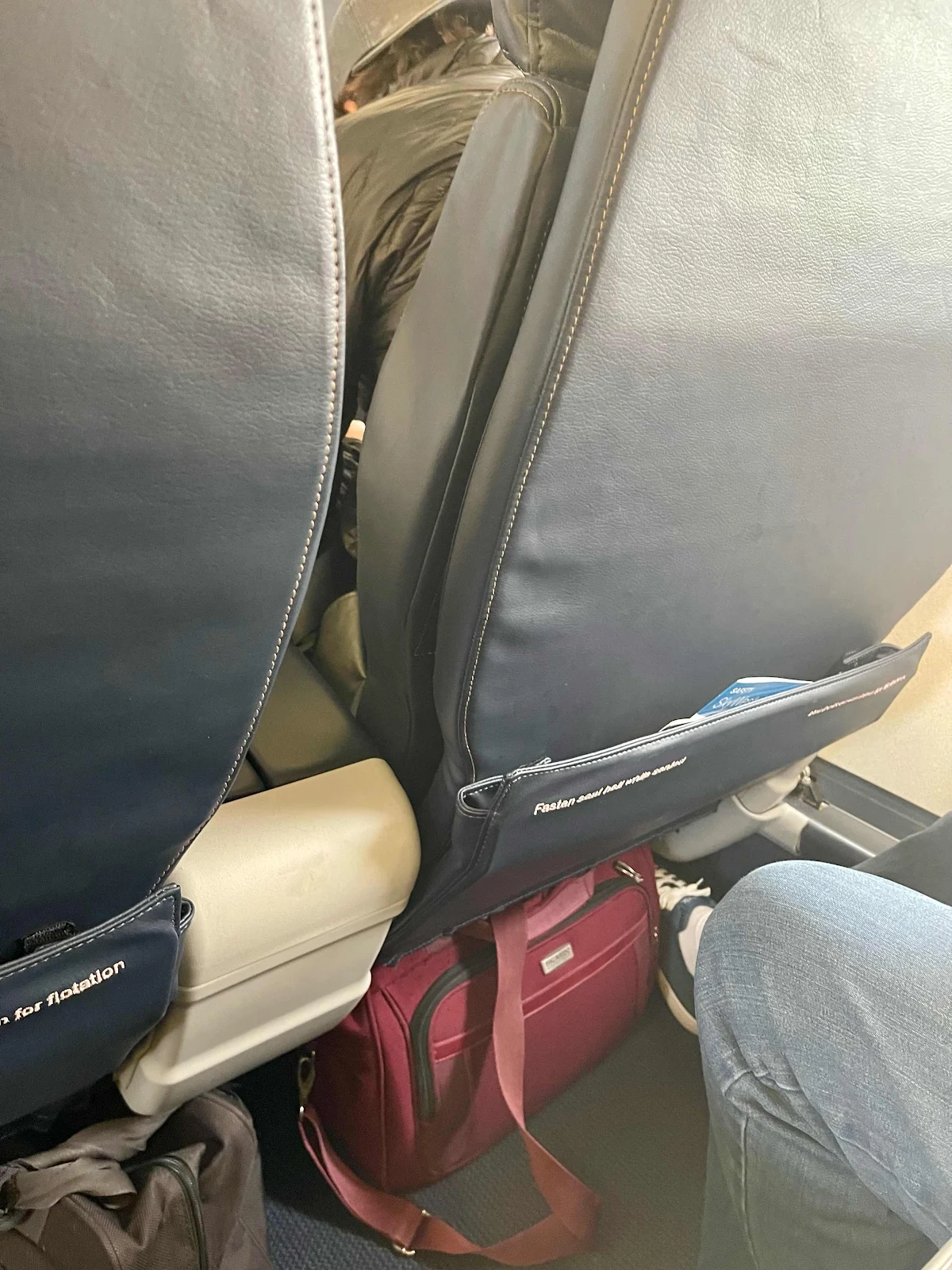Boarding at LCA is mildly chaotic, with gate lice blocking the way. We do find a path eventually and squeeze into our seats in Row 5.