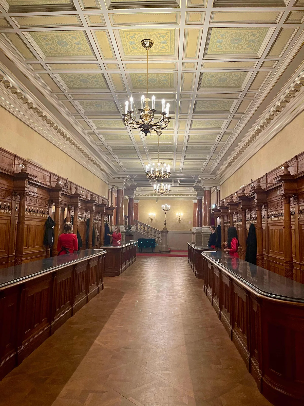 The employees, including the ushers and cloakroom attendants, are all smartly attired.
