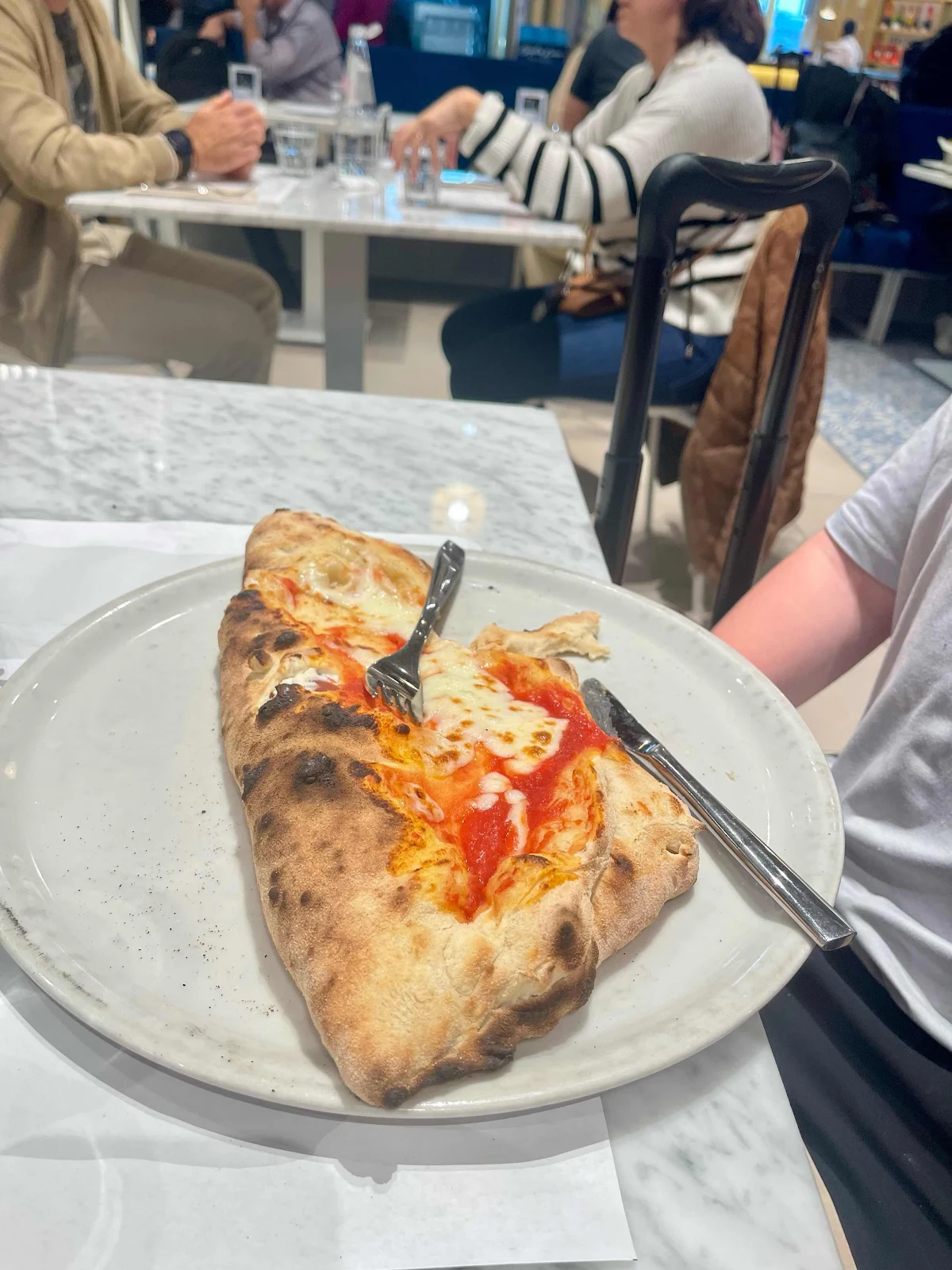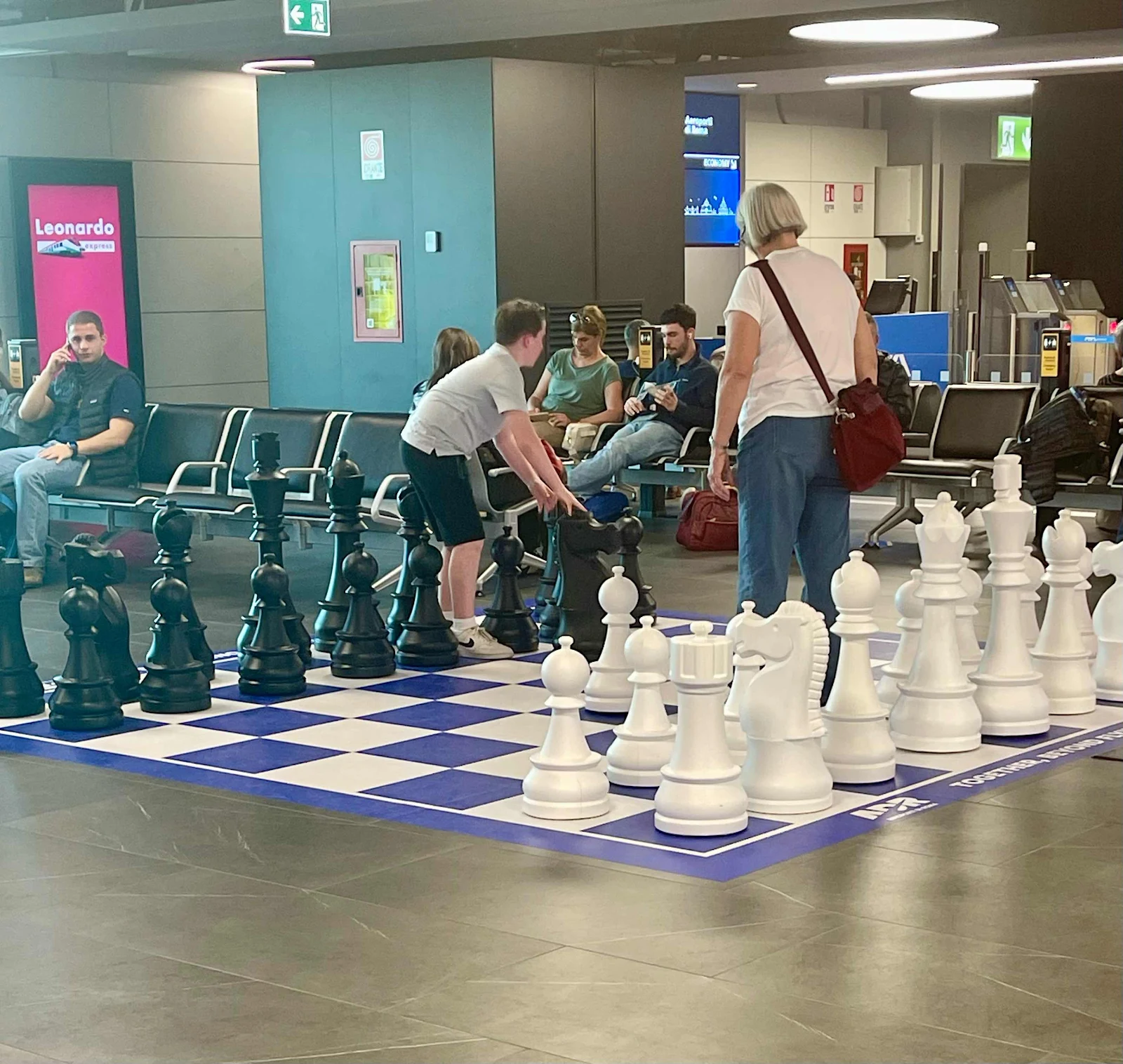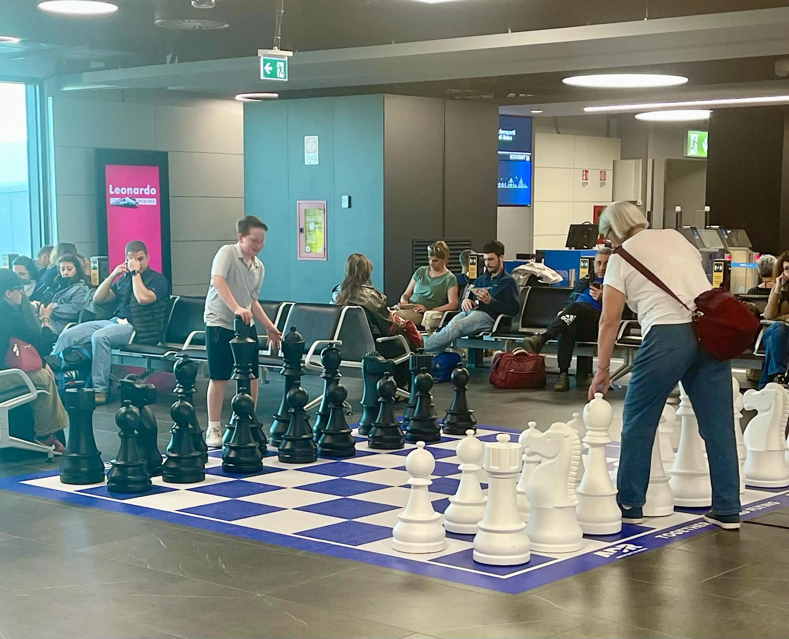 At Rome Airport (FCO), Jace enjoyed his first Calzone, and had time to show Kathy a couple of chess moves on a large board.