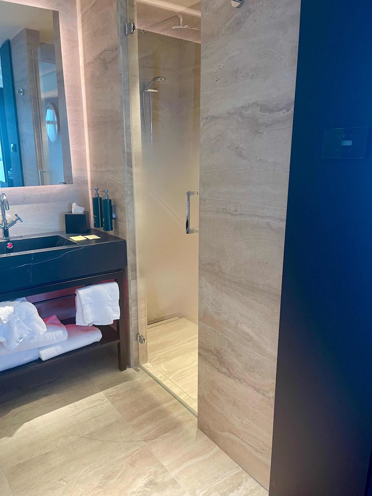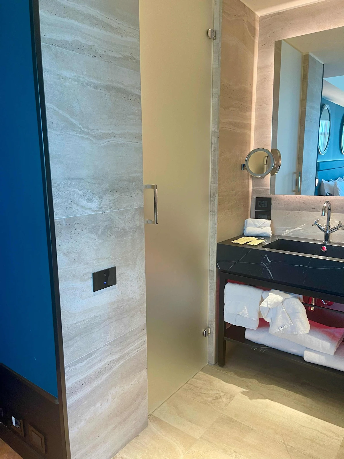 The room also incorporated a strange glitch commented on by TripAdvisor reviewers: The “bathroom” consists of an enclosed toilet on the left, a shower stall on the right, and a central area with a sink and no door, and thus no private place to towel off and get dressed.