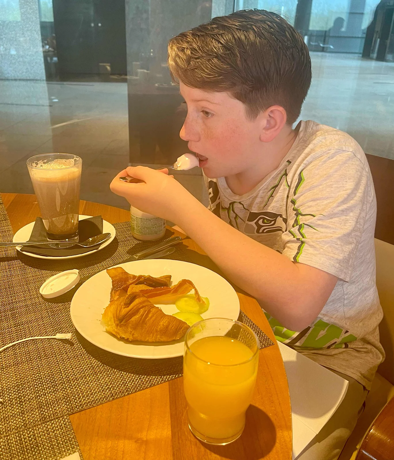 We enjoyed a good breakfast the following morning, where Jace savored his favored breakfast menu of croissants, crisp bacon, yogurt, hot chocolate, and freshly squeezed orange juice.