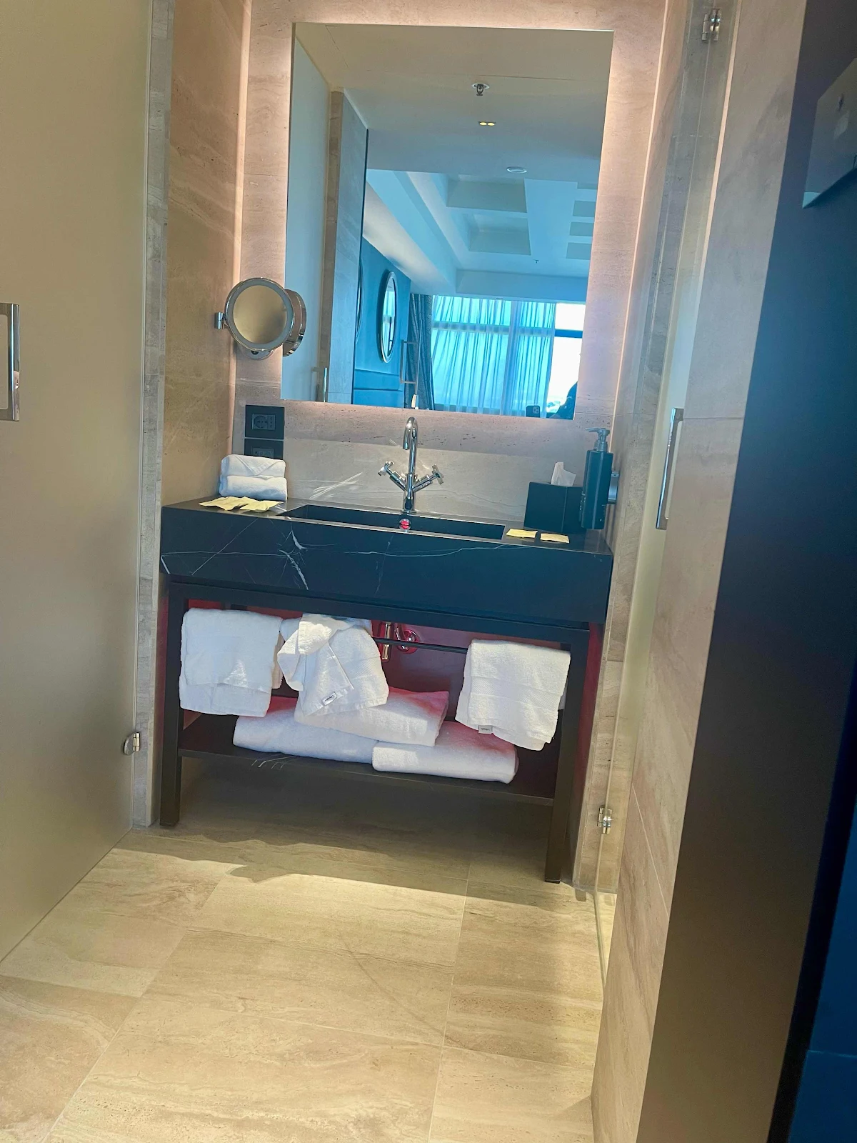 We solved that bizarre lack of privacy by having morning coffee and hot chocolate in the Executive Lounge while one of us showered and dressed, and lingering in the quite excellent restaurant after breakfast while another took a turn. We made it work.