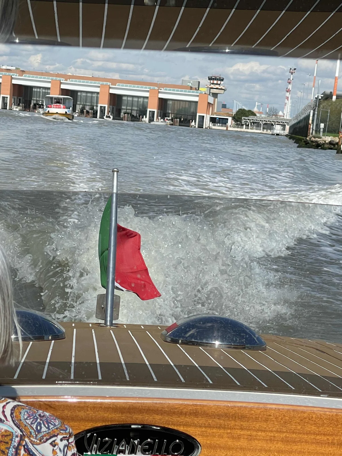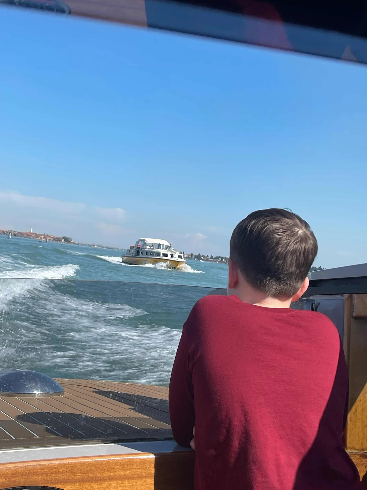 Once we’d traversed the rather long walk, eased by moving sidewalks, to the water taxi area, a Consorzio Motoscofi Venezia rep intercepted us and ushered us into our very own speedboat. A blissful ride ensued, and Jace appeared to enjoy it almost as much as Brian did.