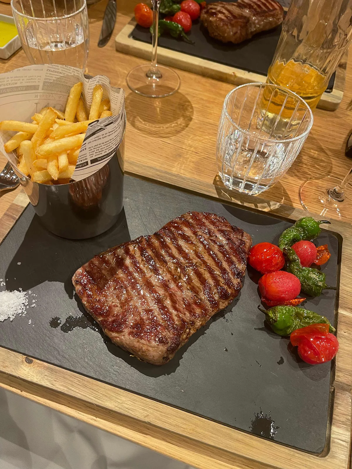 Kathy is feeling fine and four of us dine on steak in the hotel’s restaurant.