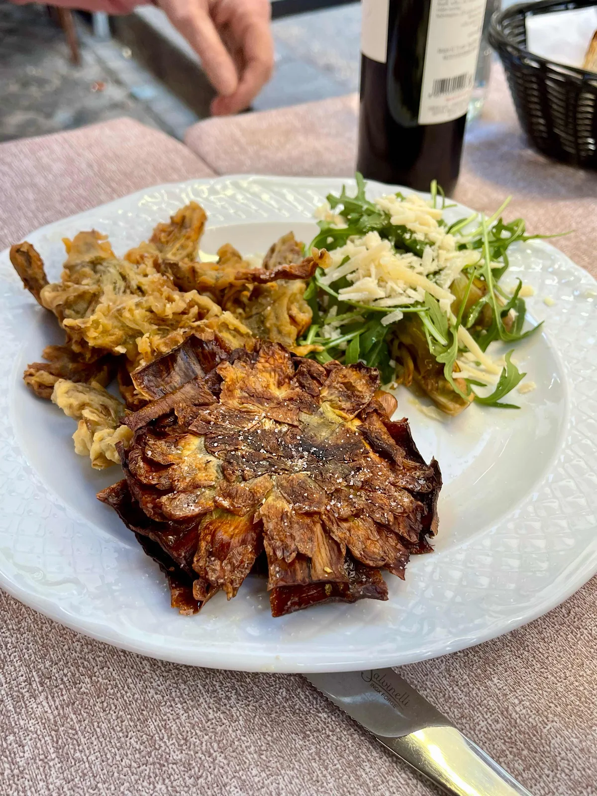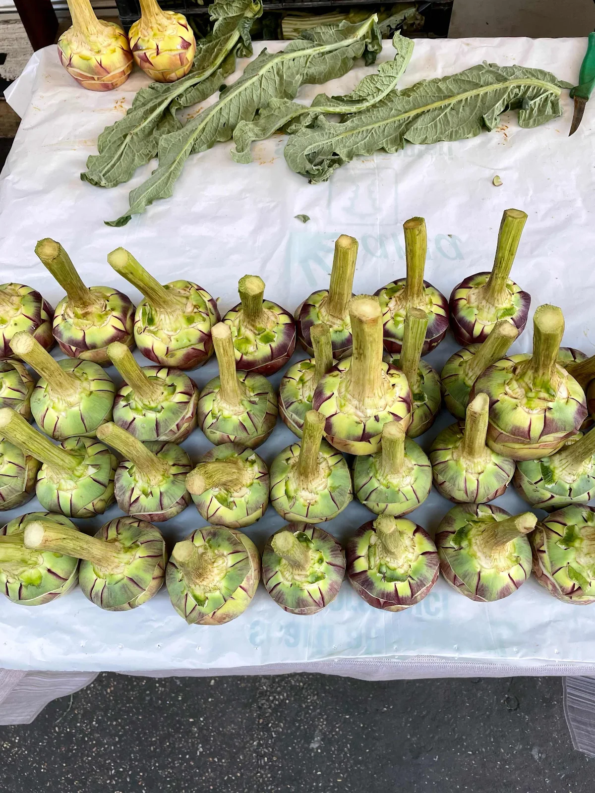 The owner sits out front carving up the artichoke, telling us he trims about three hundred a day.