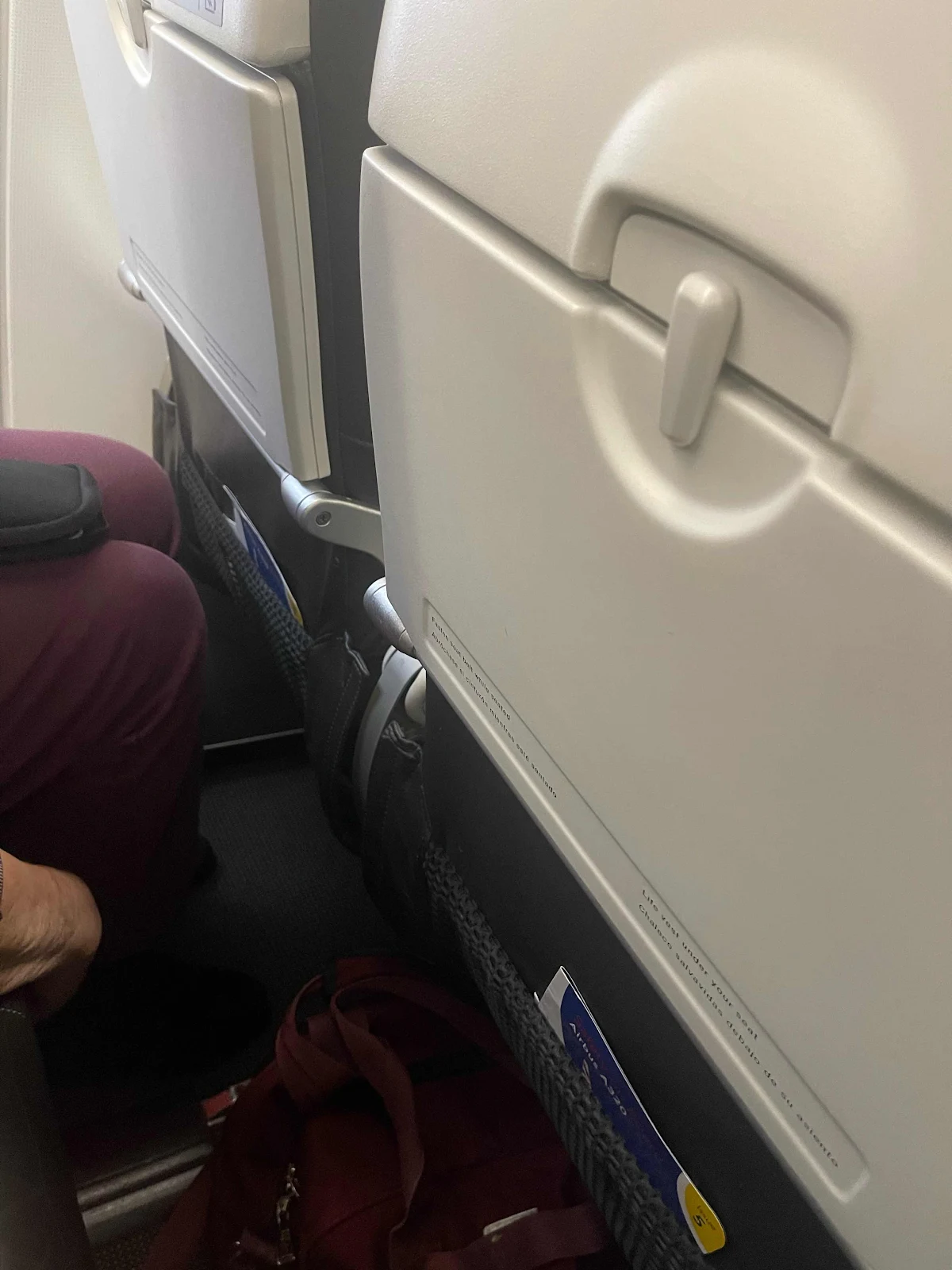 Boarding had already started, and we were fortunate to find space in the overheads for our rollaboards. Finding space for our knees on the A320 was equally challenging.