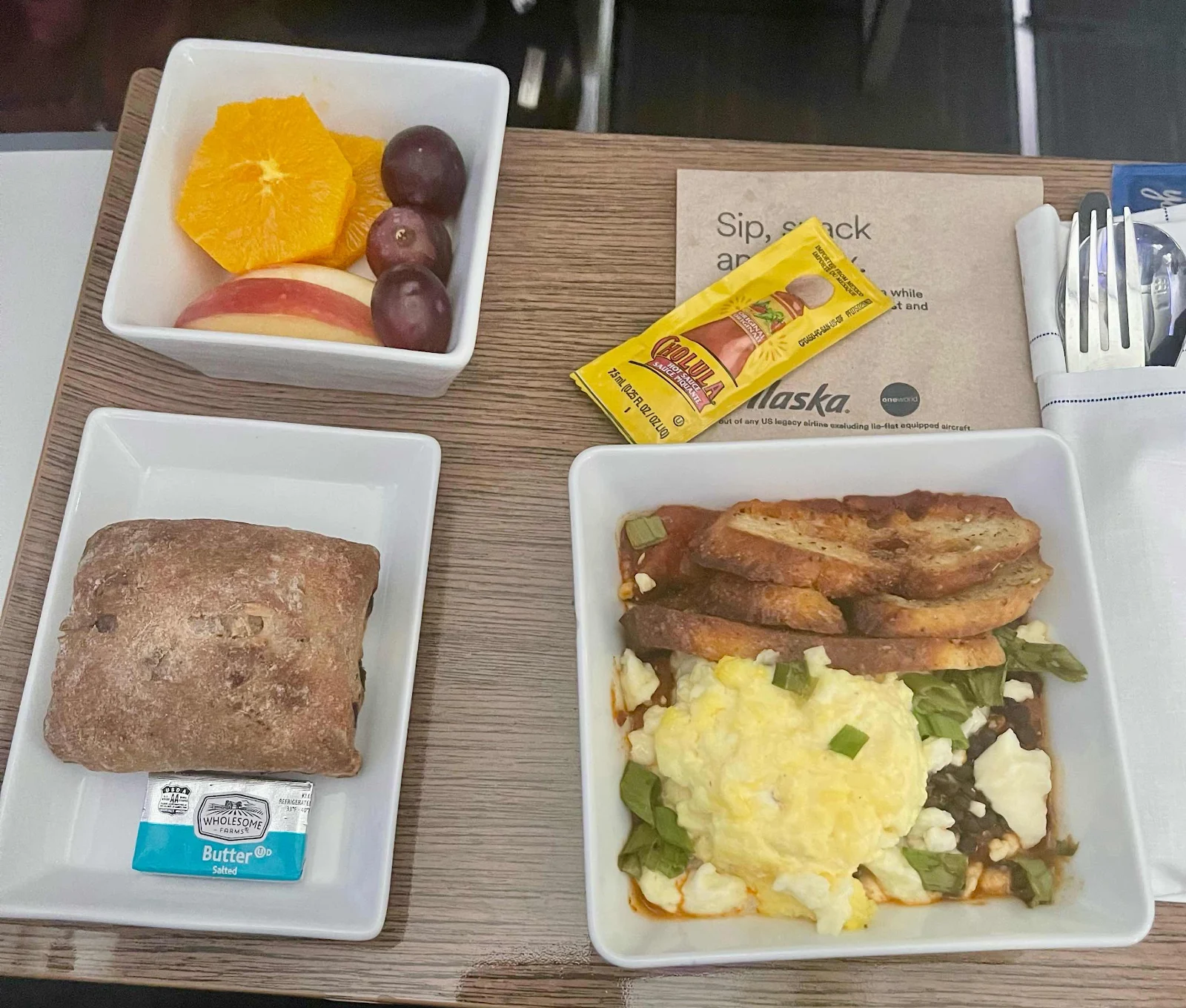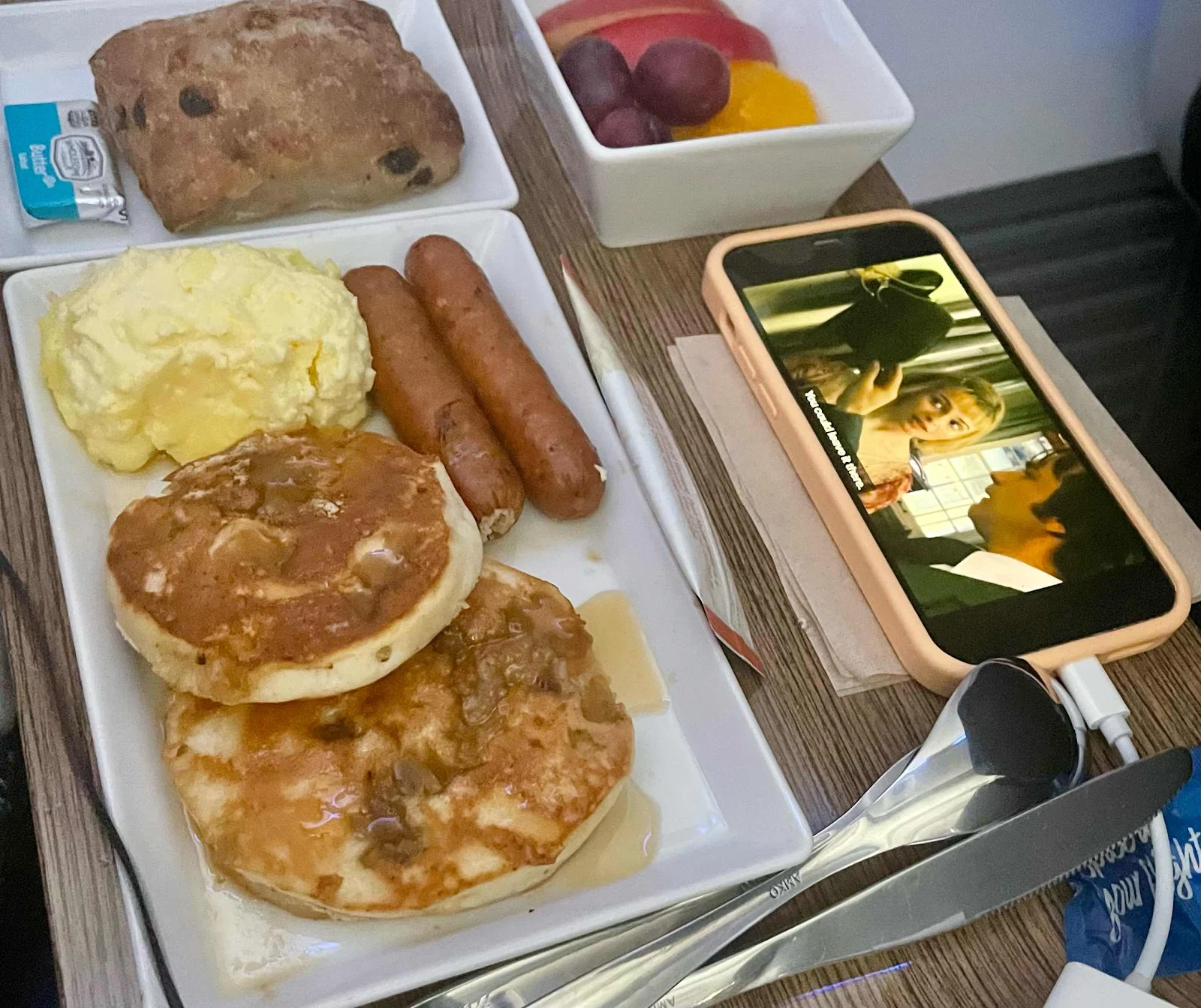 We're seated in Premium Economy and enjoy free WiFi, courtesy of our T-Mobile cell phone plans. We dine on the pretzel sliders. They're messy and may not be worth the trouble.